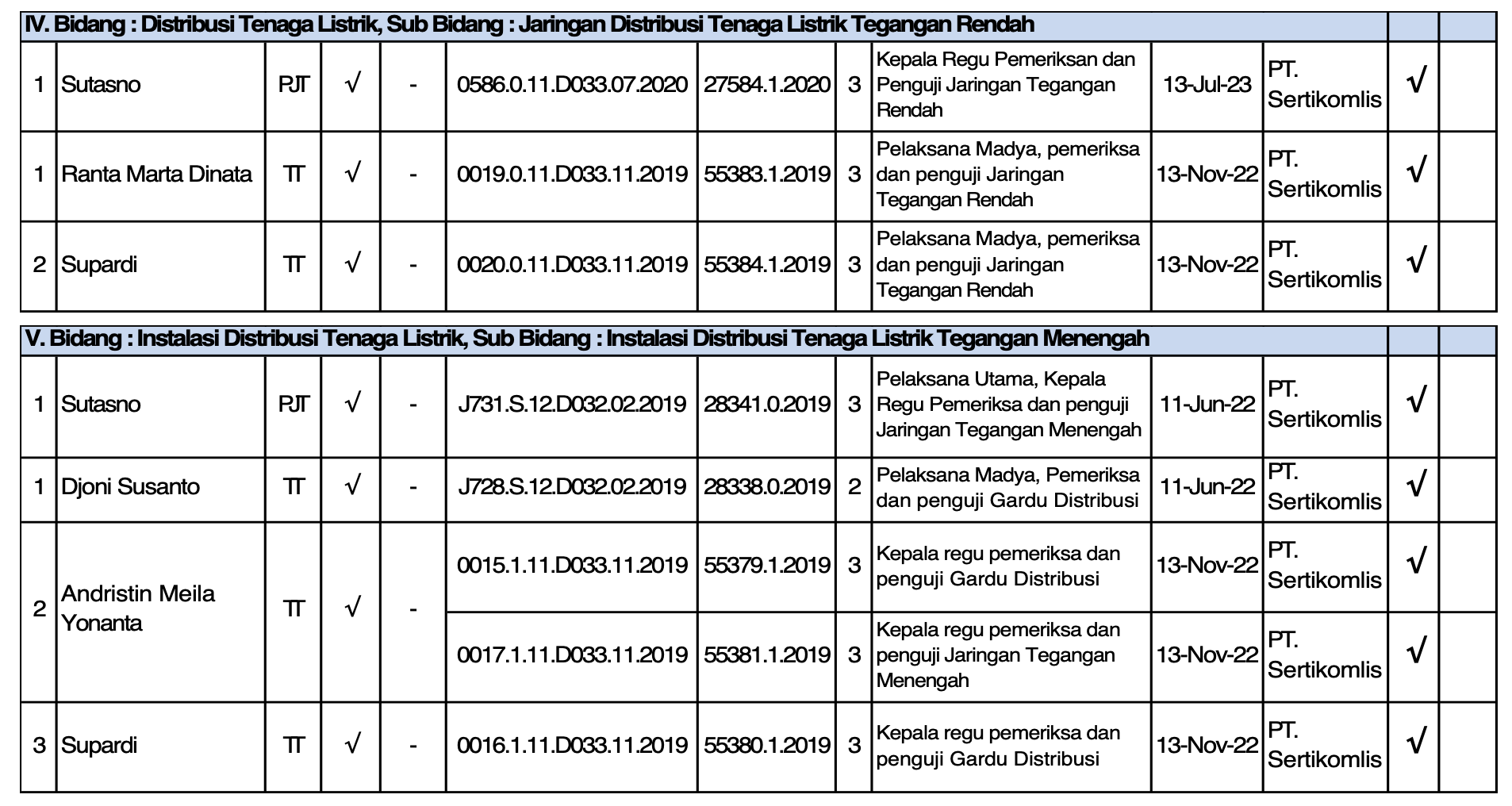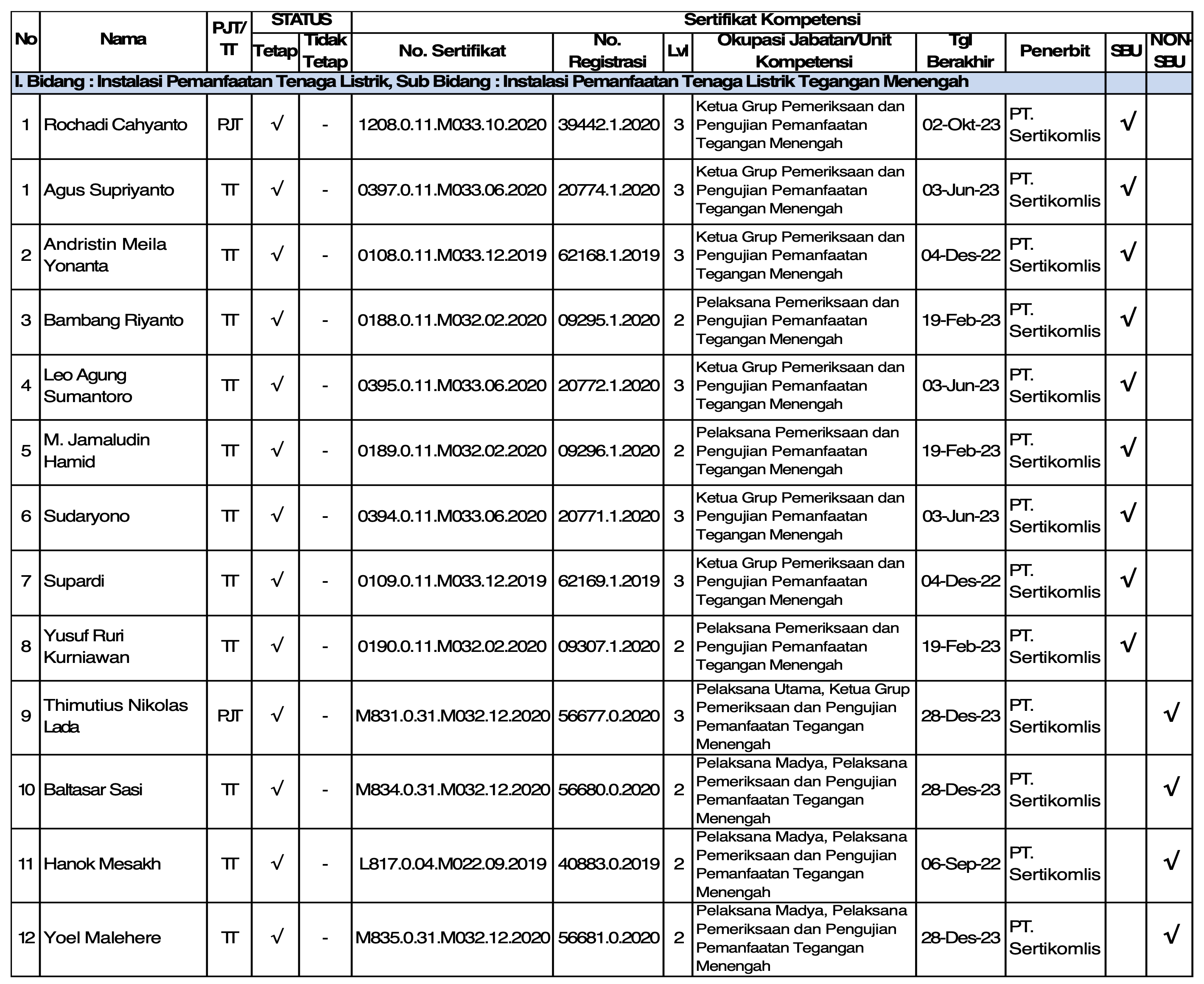 Daftar Nama dan Kompetensi Seluruh Penanggung Jawab teknik (PJT) dan Tenaga Teknik (TT)